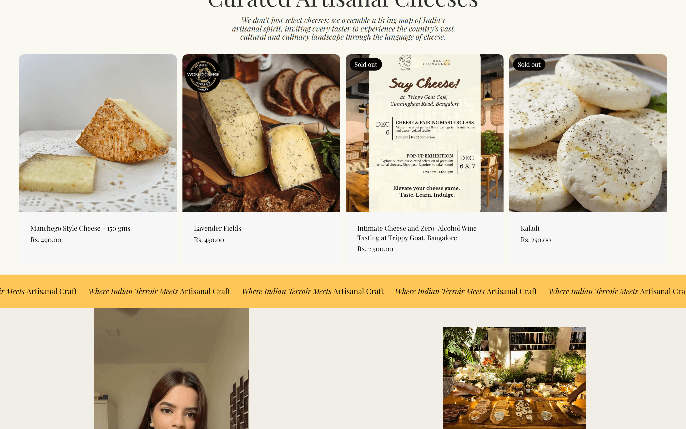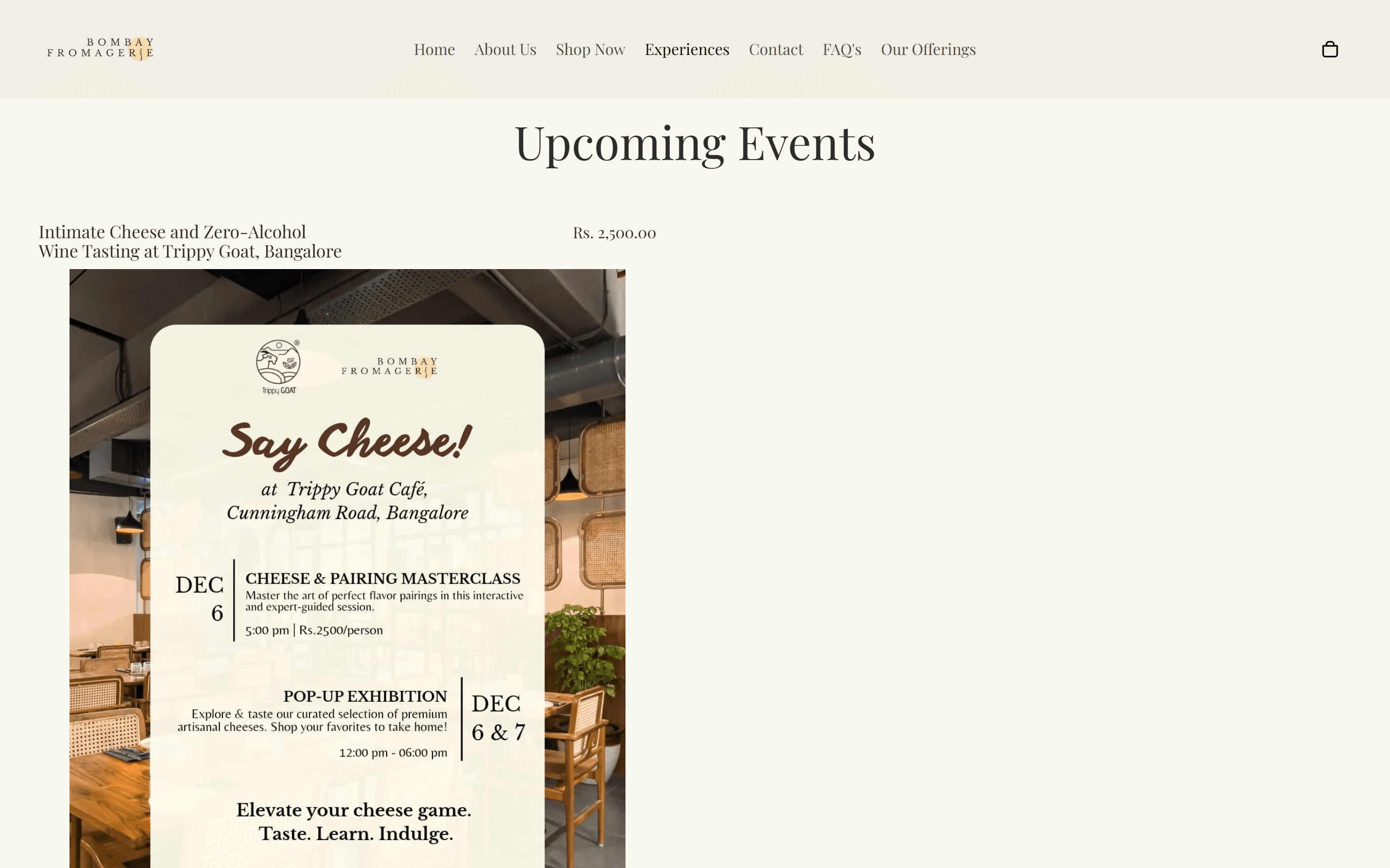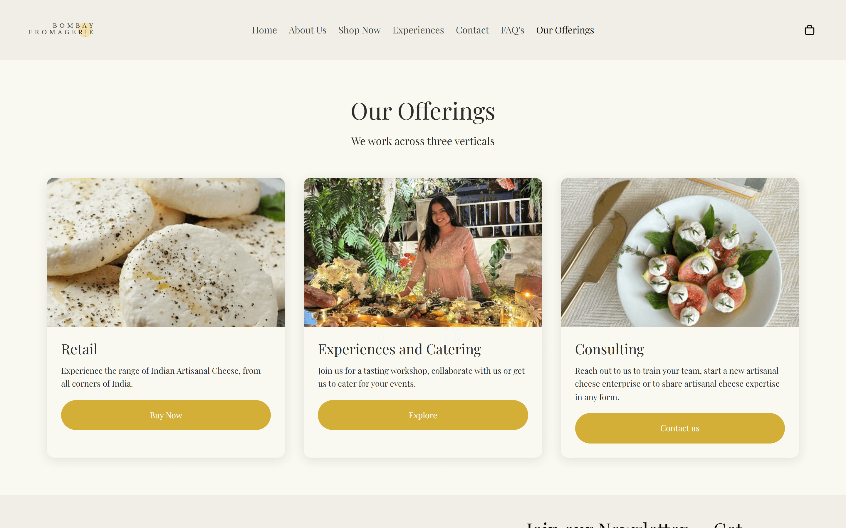 Bombay Fromagerie is not just a shop. The business runs retail, in-person experiences, and consulting in parallel. The old homepage had no way to surface this: all three looked like afterthoughts or weren't visible at all. A dedicated mid-scroll section introduces the three lines with direct links to the Offerings page, built to route the right customer to the right funnel before they leave.
