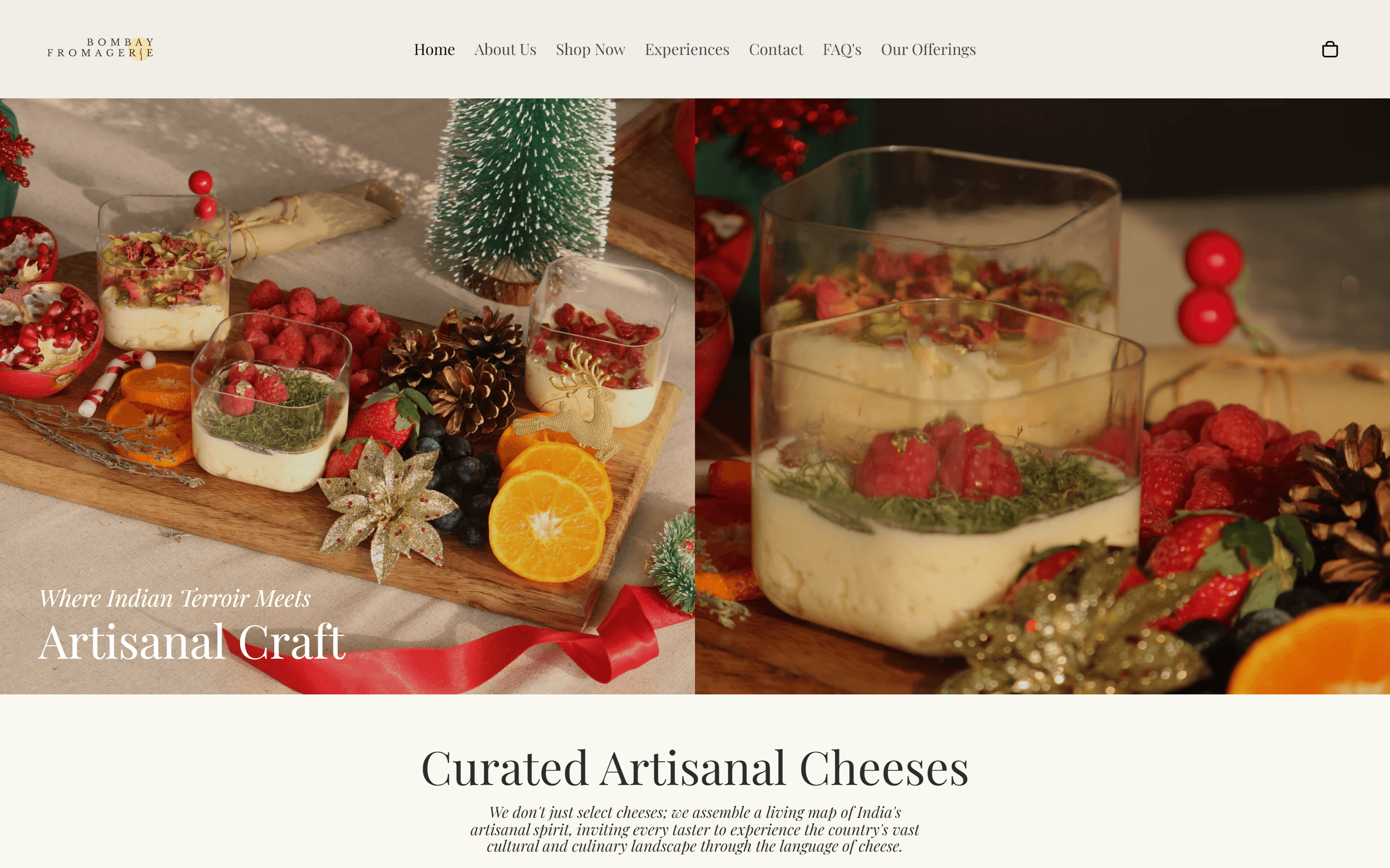 Bombay Fromagerie. Seven collections, three business lines, two certified cheesemongers. One Shopify store that earns the premium before the add-to-cart.