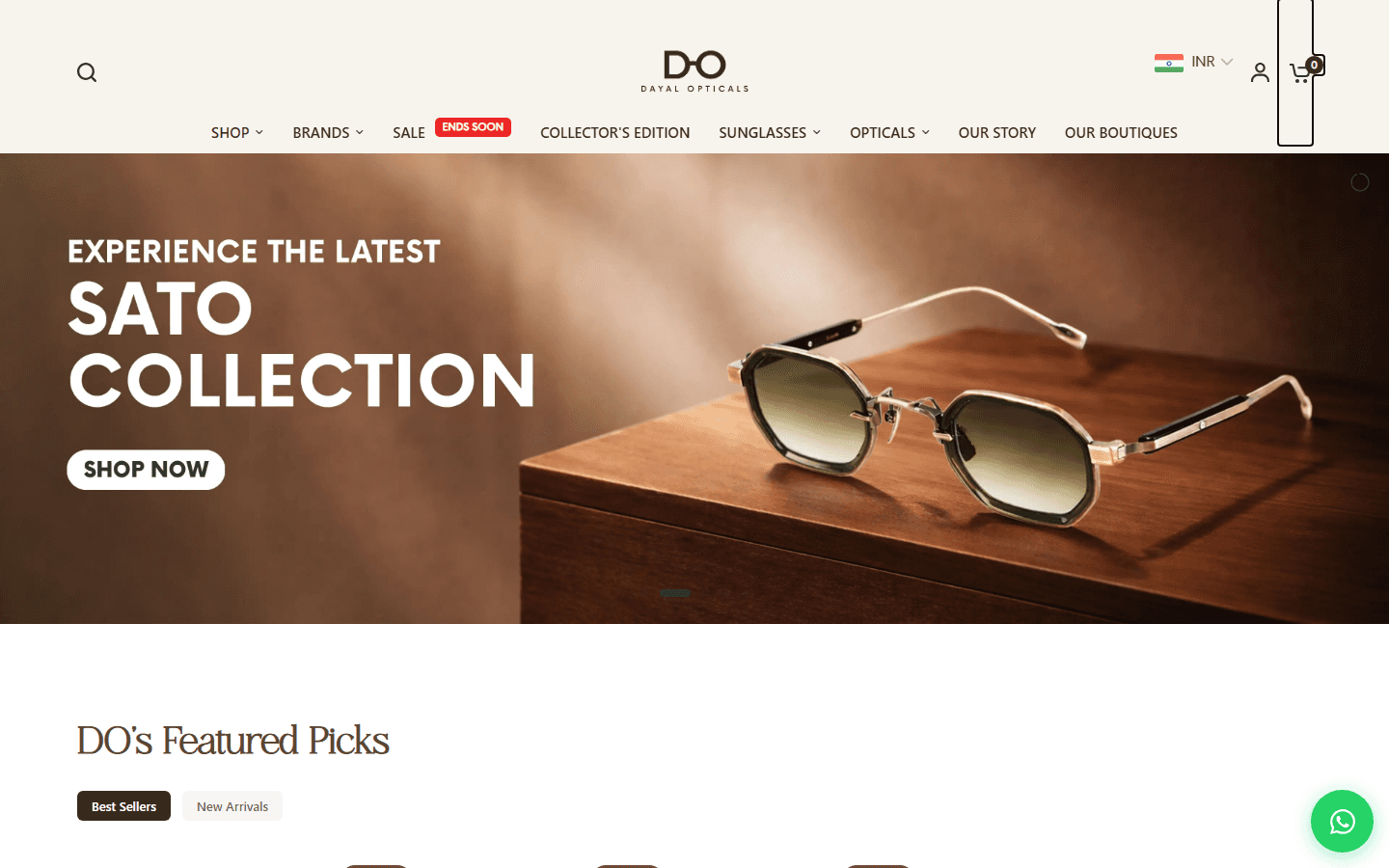 The old site opened with a full-bleed editorial image and a SHOP NOW button. No mention of 18 boutiques, no premium brand names in the hero, no signal of the 60-year retail history behind the store. It was indistinguishable from any mid-tier fashion Shopify store. The redesign opens with an editorial campaign hero for a named collection, followed by a curated "DO's Featured Picks" shelf with tabbed Best Sellers and New Arrivals. PRADA at ₹34,390 and VERSACE at ₹24,191 appear within the first scroll. The brand's price positioning is established before the customer reaches a category page.