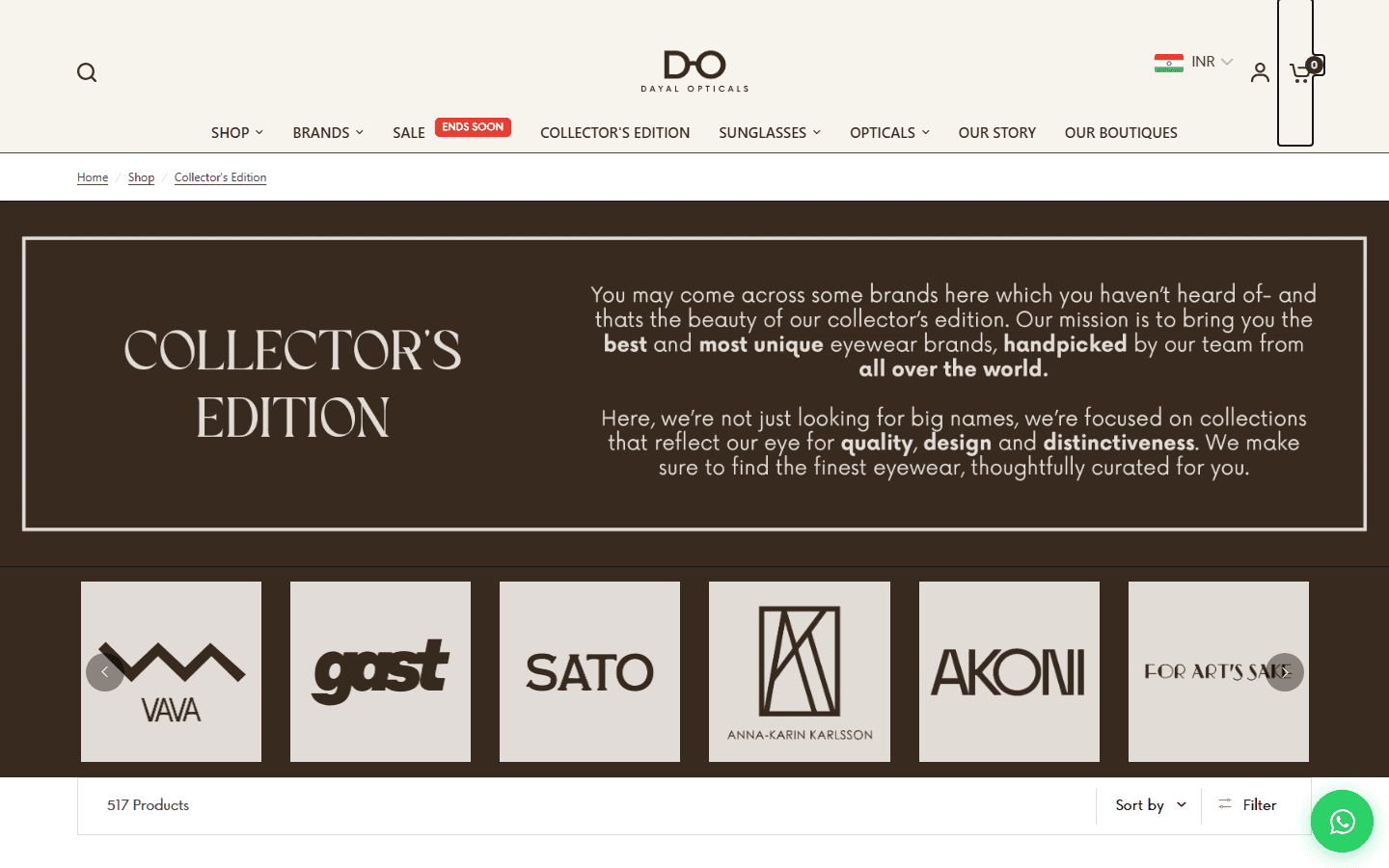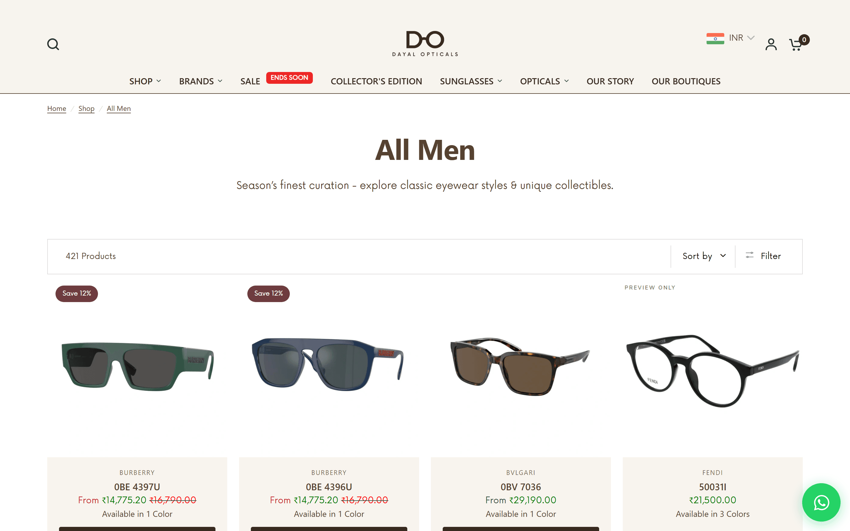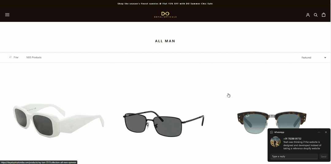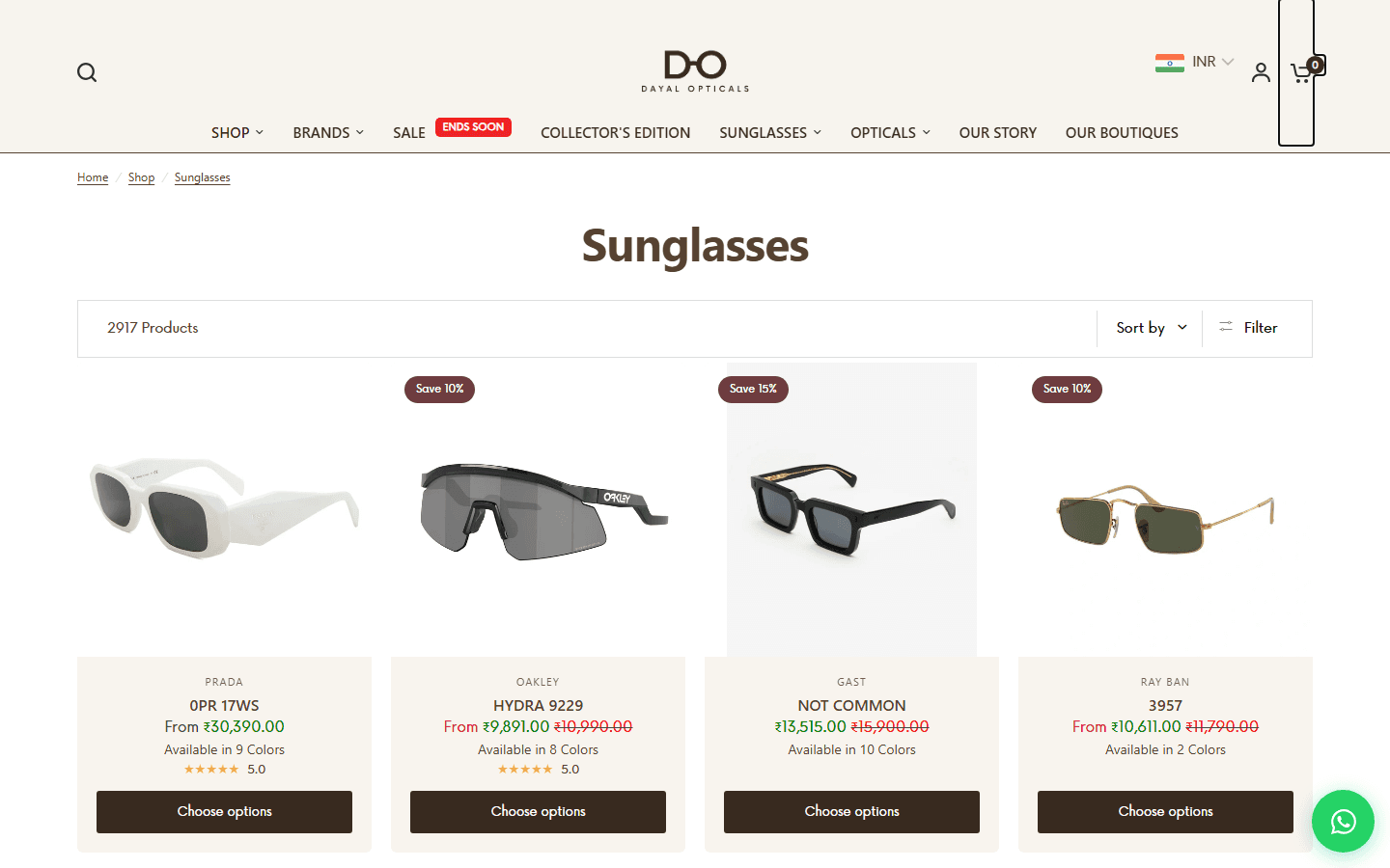 The homepage leads with the current hero collection and surfaces 60+ brands without overwhelming the customer. The catalog covers 2,917 sunglasses alone, ranging from Rs9,000 Oakleys to Rs30,000+ Pradas. The store had to feel like the brands it carries. It does.