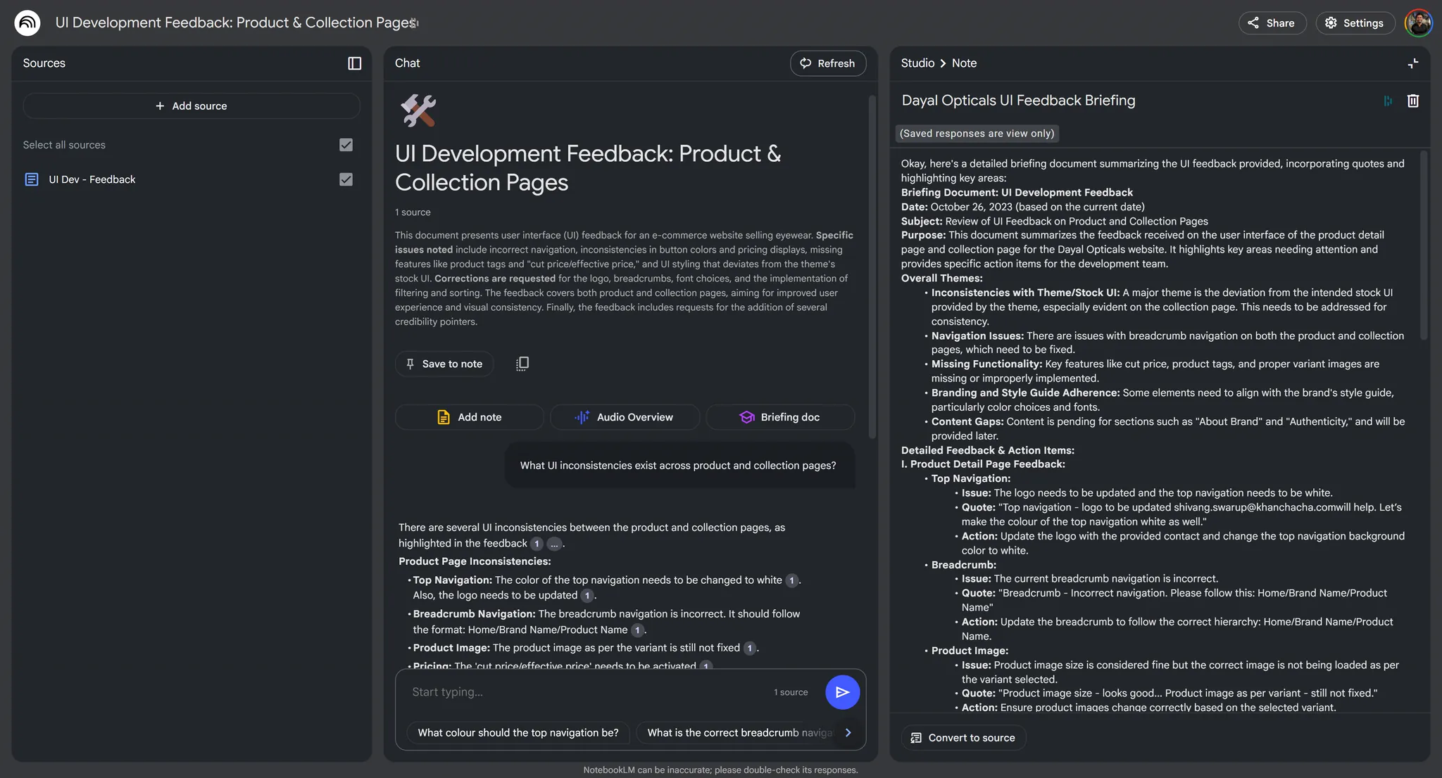 Brand documents, product catalogues, and customer review patterns were synthesised into an audio briefing using NotebookLM. Three buyer profiles emerged: gift buyers who need reassurance on quality, eyewear collectors who already know the brand name they want, and walk in regulars moving online for the first time.