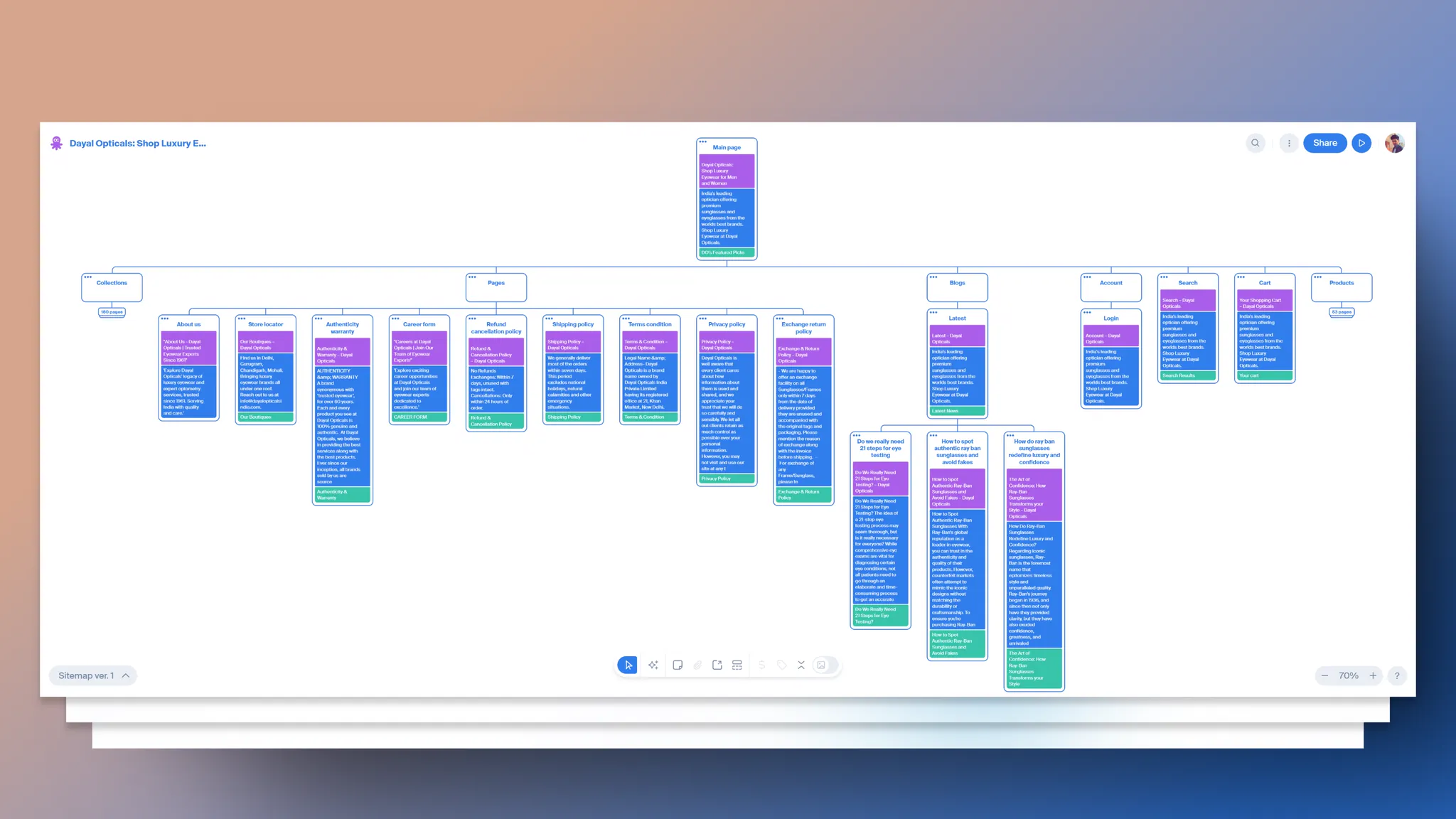 You start with a sitemap. Every collection, every policy page, every blog post, every account flow. The full site architecture was mapped in Whimsical before the first line of Liquid. The mega navigation alone had to handle 60 plus brands across sunglasses, optical frames, contact lenses, and a Collector's Edition. Get that wrong and customers bounce before they ever browse. The brand pages, the category hierarchy, the breadcrumb logic. All of it decided on paper first.
