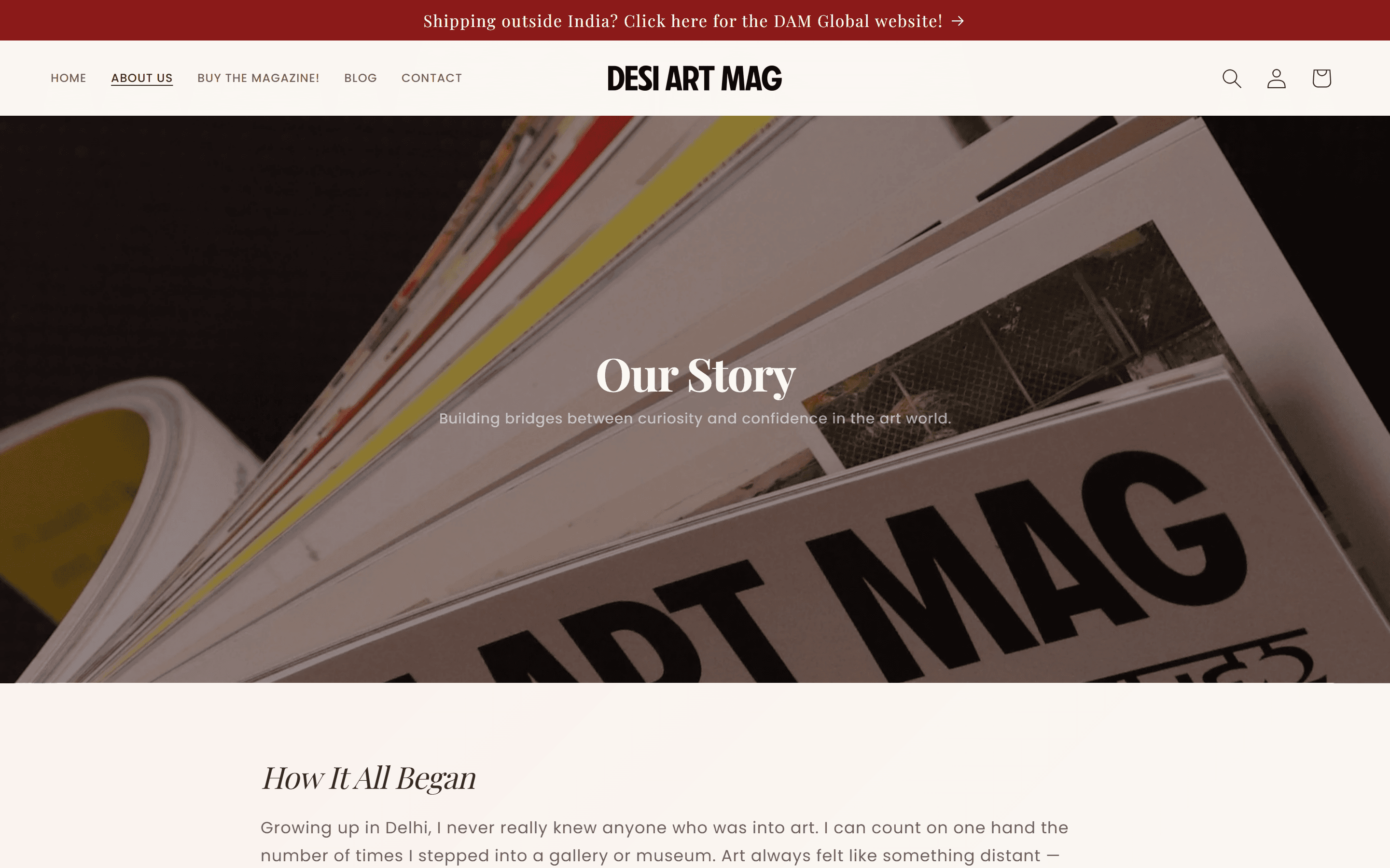 The Horizon theme assumes multiple products and collection grids. Desi Art Mag has one. The hero was stripped to its editorial core: full-bleed cover photography, a headline built around the mission, and a single pill-shaped CTA. The announcement bar at the top runs in DAM Burgundy (#8B1A1A), the store's first color signal, visible before the hero image loads.