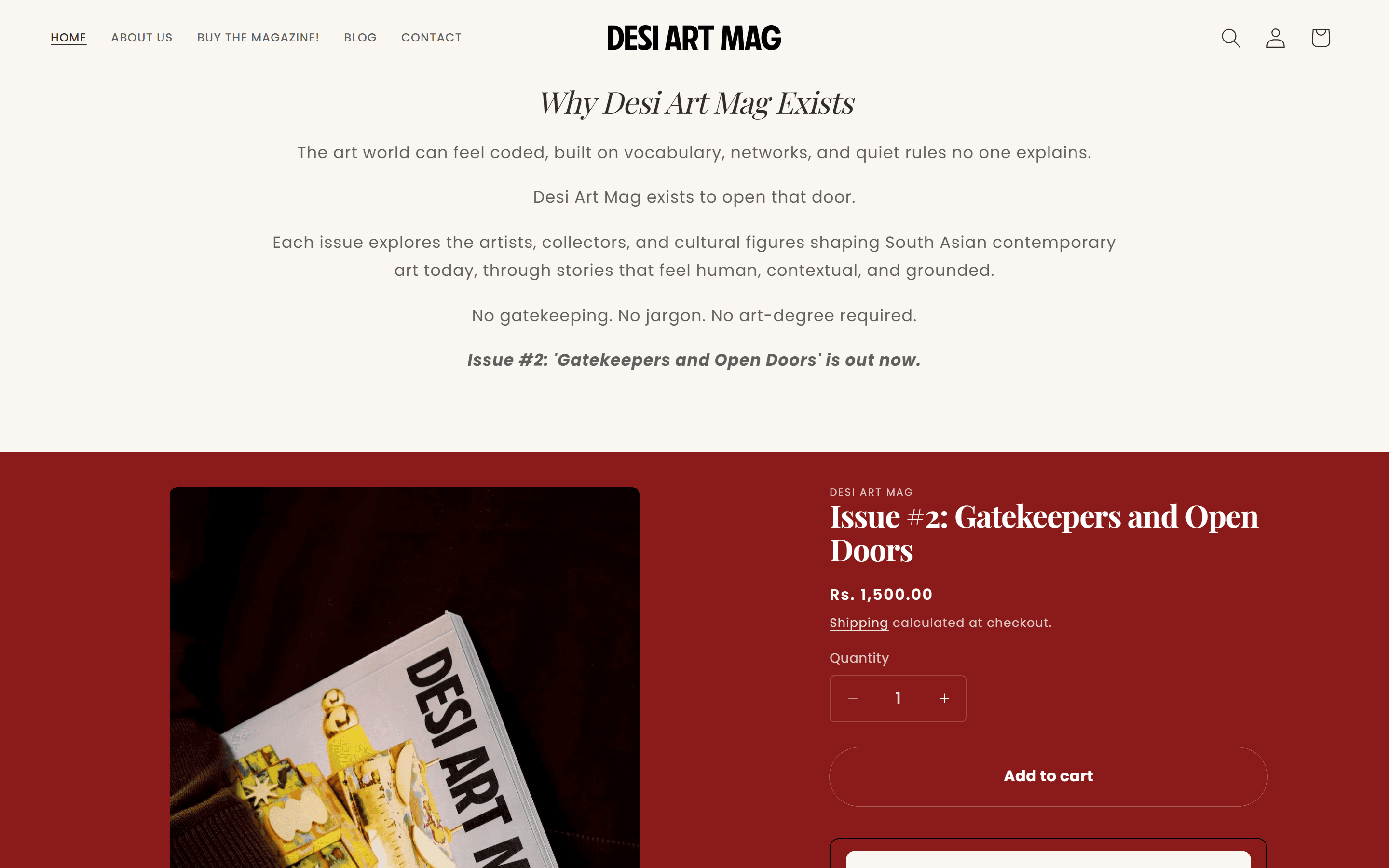 Shopify's Horizon sections are designed to push product. The first scroll below the hero is editorial instead: 'Why Desi Art Mag Exists' in Playfair Display italic, followed by three lines of mission copy. The product embed follows directly below, same page, different intent. Most single-product stores send visitors straight to Add to Cart. This one earns the click first. The purchase decision becomes a choice, not a prompt.