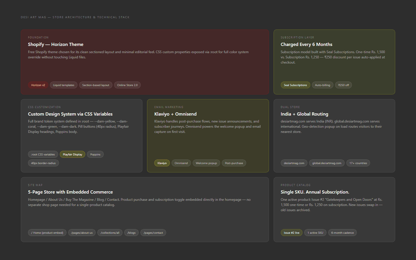 Shivansh Wadhwa needed a store that could sell the magazine as both a one-time purchase and a recurring subscription. Shopify's native checkout handles one-time orders only, so a subscription app was integrated to auto-charge every 6 months at Rs. 250 less than the single-issue price. The store runs on Shopify's Horizon theme, with all brand colors and typography applied through :root CSS variables without touching any Liquid files. Two separate storefronts handle the global split: desiartmag.com for India (INR) and global.desiartmag.com for international readers.