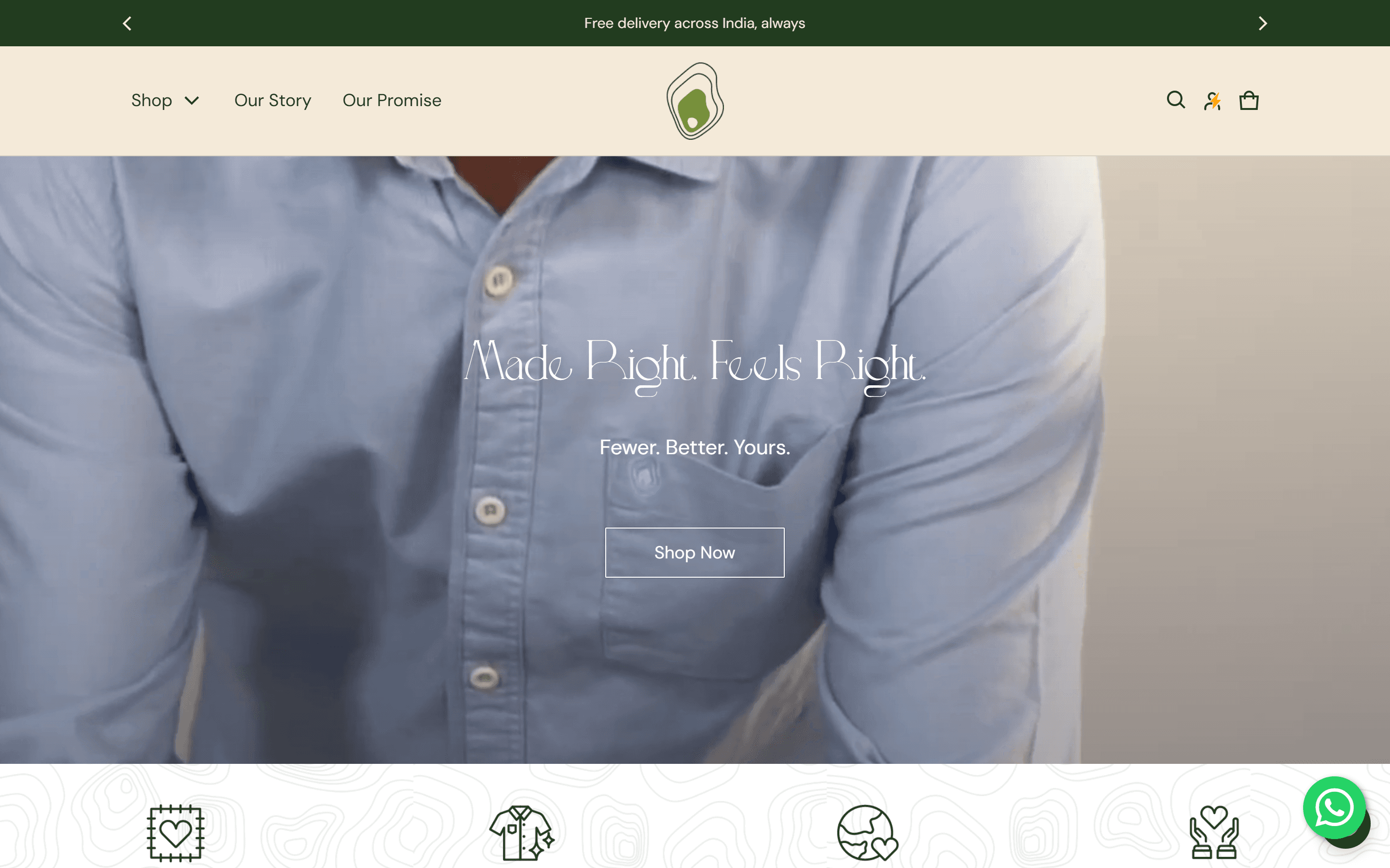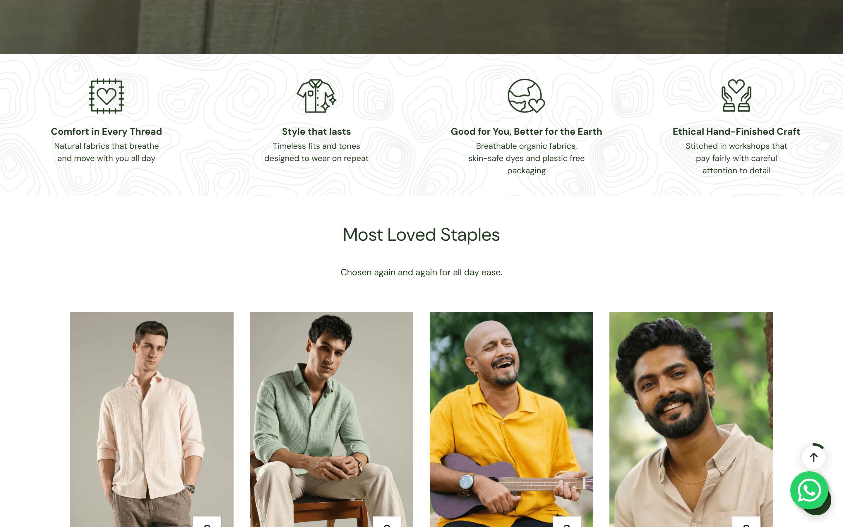 The original USP section used outline-only icons at a size too small to parse on desktop. The four pillars — Comfort in Every Thread, Style that Lasts, Good for You Better for the Earth, Ethical Hand-Finished Craft — were present but invisible. Icons were replaced with filled versions, type was scaled up for legibility, and the background was given a subtle topographic texture that runs through the brand's visual language. Below it, the Most Loved Staples shelf shows the range: Dawn Gauze at ₹2,999, Meadow Waffle at ₹3,799, Sunshine Linen at ₹3,499. The section reads as designed, not inherited.