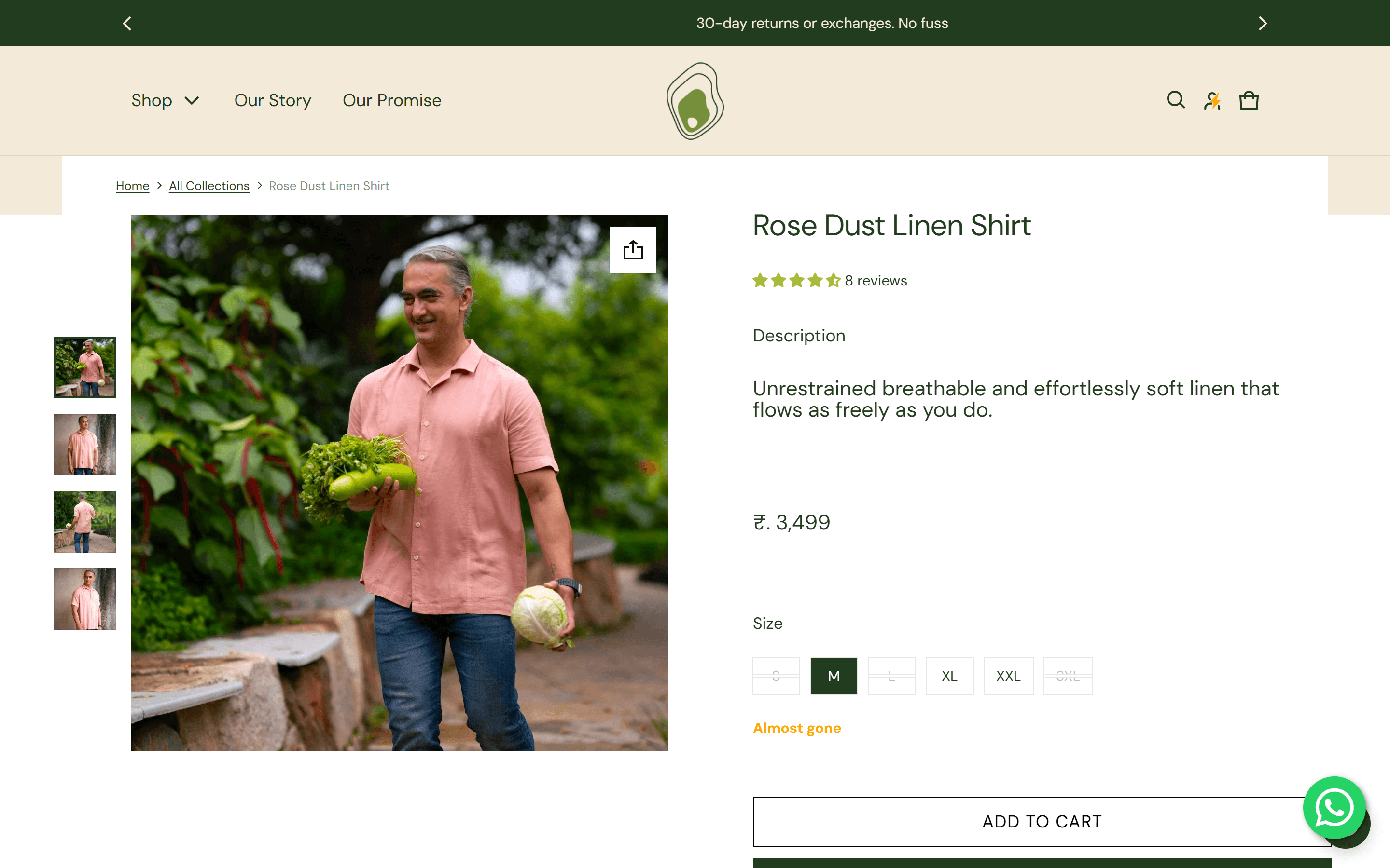 The store had the products but not the infrastructure to sell them. The homepage did not communicate brand values. The product detail page showed a photo and a price with no context for what made each shirt worth buying: no delivery estimate, no fabric-specific size guidance, no self-serve return or exchange path. The announcement bar, side cart, USP section, and footer were all on default theme behaviour. The four-week engagement covered the homepage end to end, a PDP rebuild with custom size chart, delivery ETA pincode checker, and product feature icons, a WhatsApp integration, email flows, a returns and exchange page, a track order experience, and visual rebuilds of the Our Story and Our Promise pages.