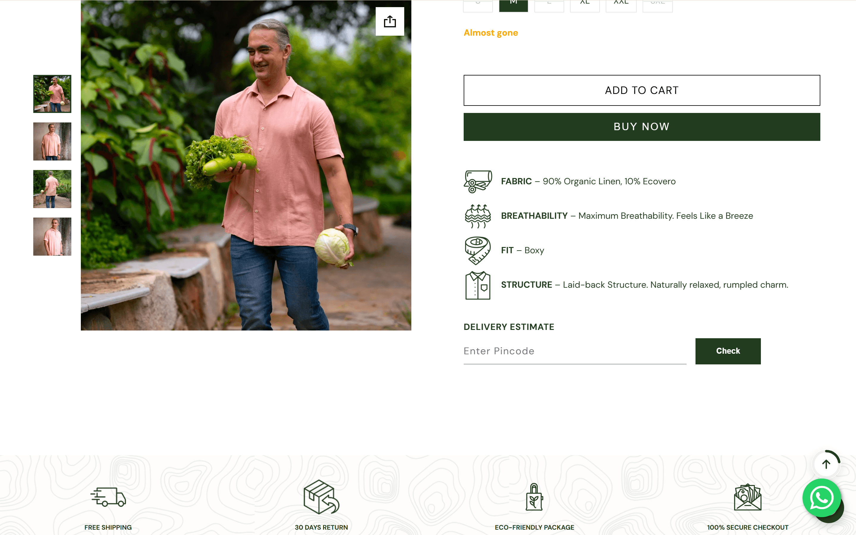 The default PDP gave a customer a product image, a size selector, and an add-to-cart button. Nothing explained what made a ₹3,499 linen shirt worth buying, or whether the standard size would fit this cut. Three additions changed it: a custom size chart mapped to each fit type — Boxy, Relaxed, Slim — rather than a generic guide; a Delivery Estimate field using Shopify's pincode API so the buyer sees arrival date before committing; and four product feature icons placed directly below the buy buttons, each with a one-line spec: Fabric composition, Breathability level, Fit name, Structure. The wishlist icon was moved next to the product title. Every question a considered buyer has is answered on the page.