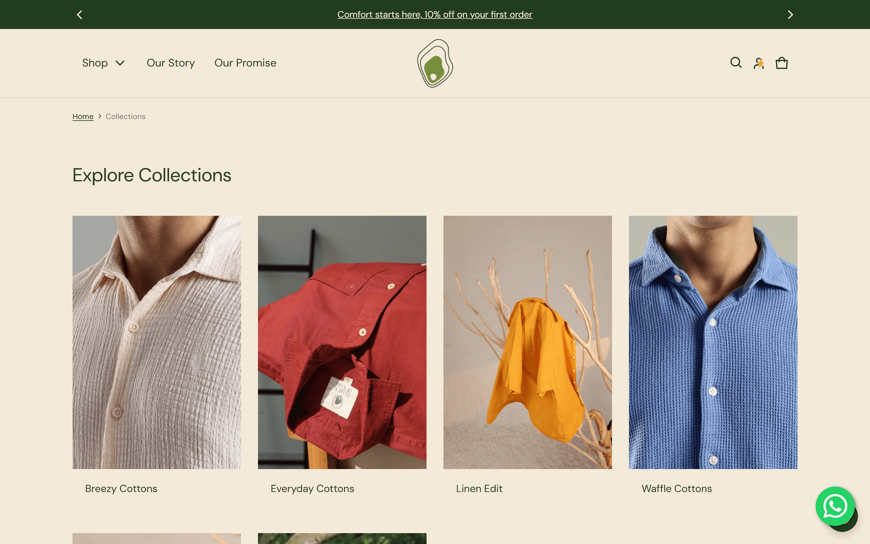 Islands of Loom organises its shirts by material and construction, not by season or colour: Breezy Cottons, Everyday Cottons, Linen Edit, Waffle Cottons, Hemp Series, and Most Loved. The collections page was structured to make this fabric-first logic legible. Each card uses an editorial close-up of the material — Breezy Cottons shows gauze weave texture, Linen Edit shows drape, Waffle Cottons shows the grid structure. The page becomes a material guide before it becomes a product browse. A customer who knows they want linen lands in the right place without scrolling through 32 products.