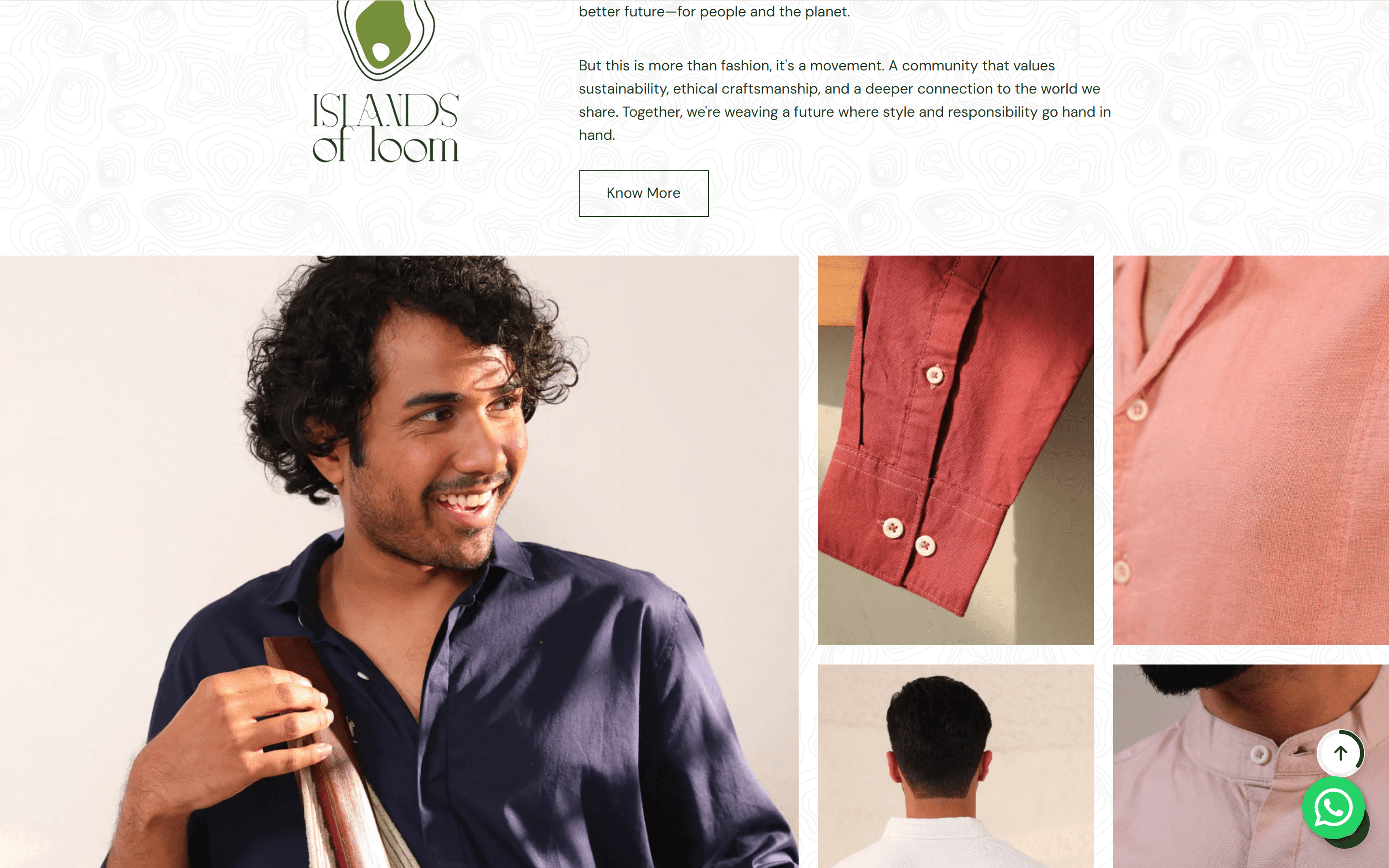 Islands of Loom's founding thesis — sustainable menswear from India's natural fibres — was not visible in the primary shopping experience. The Woven with Purpose section was built into the homepage as an editorial block: one full-height lifestyle image on the left, four detail shots arranged on the right, and brand copy positioned beside the logo. "Islands of Loom was born from a passion for mindful living, creating sustainable clothing that inspires conscious choices." The customer browsing the product shelf above sees it. The one reading more carefully stops here. The section functions as a mission statement, not a filler block.