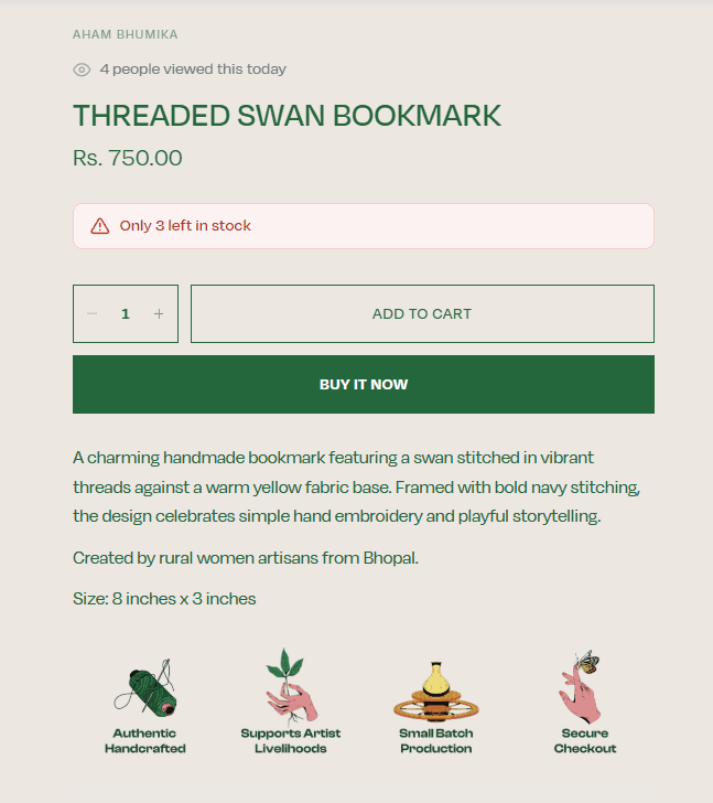 The original PDP showed the product, a description, and an add-to-cart button. No social proof, no scarcity, nothing to move a hesitant buyer. The rebuilt page runs a live view counter that follows realistic Indian traffic patterns, peaking between 11 AM and 6 PM, incrementing by one every 25 to 55 seconds. Stock urgency kicks in at three thresholds: 'Only X left' below 4 units, 'Low in stock' between 5 and 9, 'Selling fast' between 10 and 15. The add-to-cart button is sticky. Judge.me reviews auto-publish with verified buyer badges. Every signal ties to real Shopify inventory data.