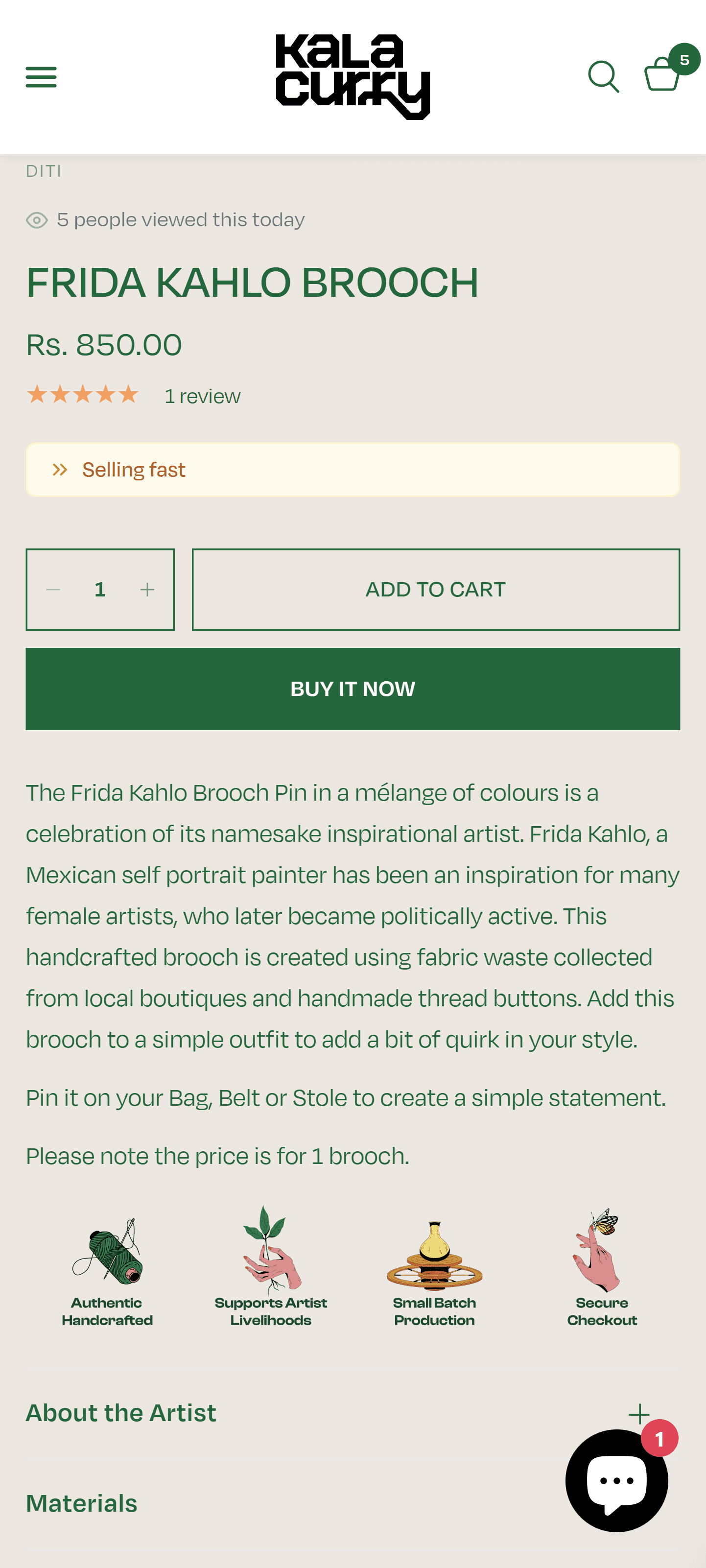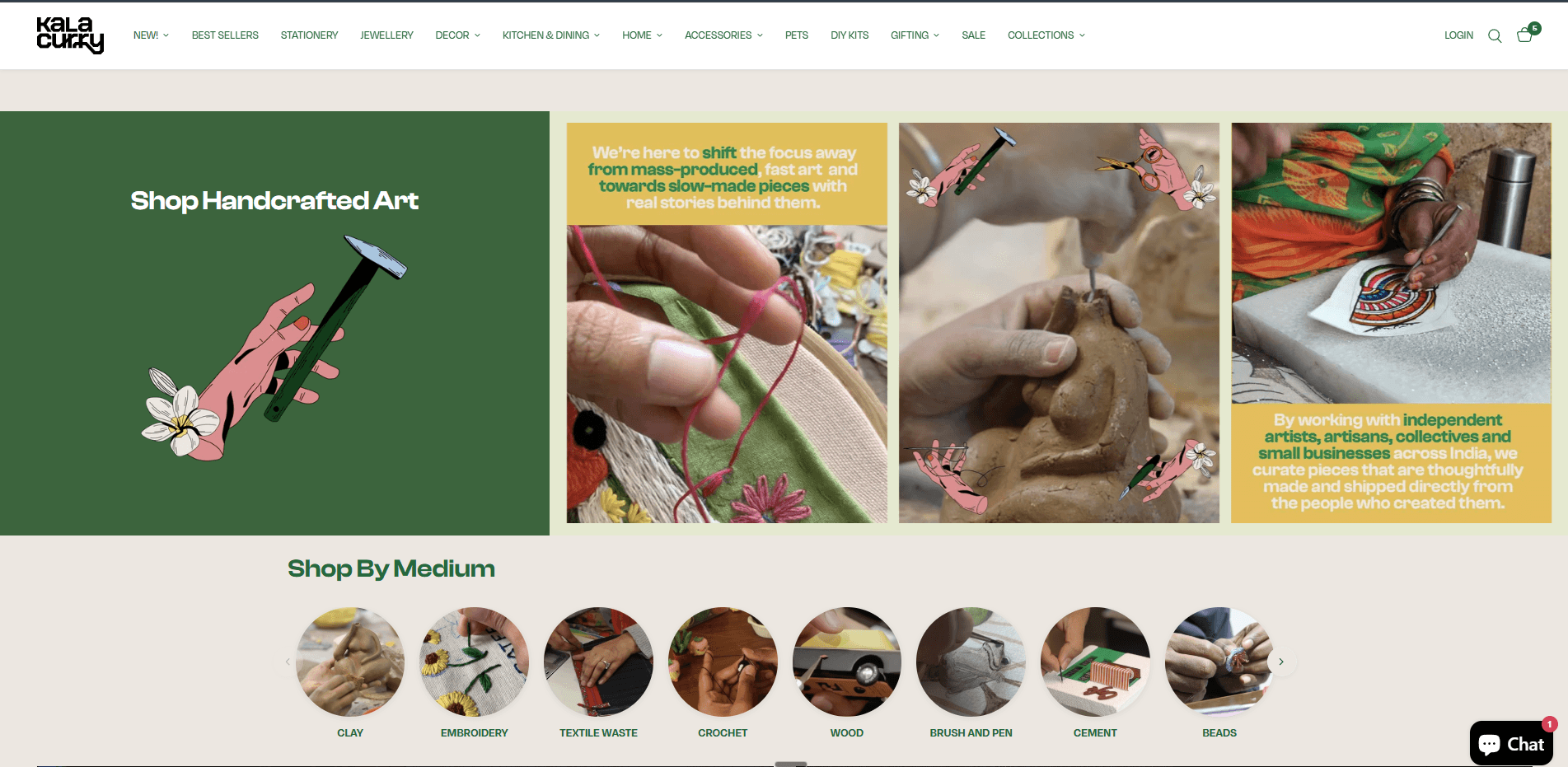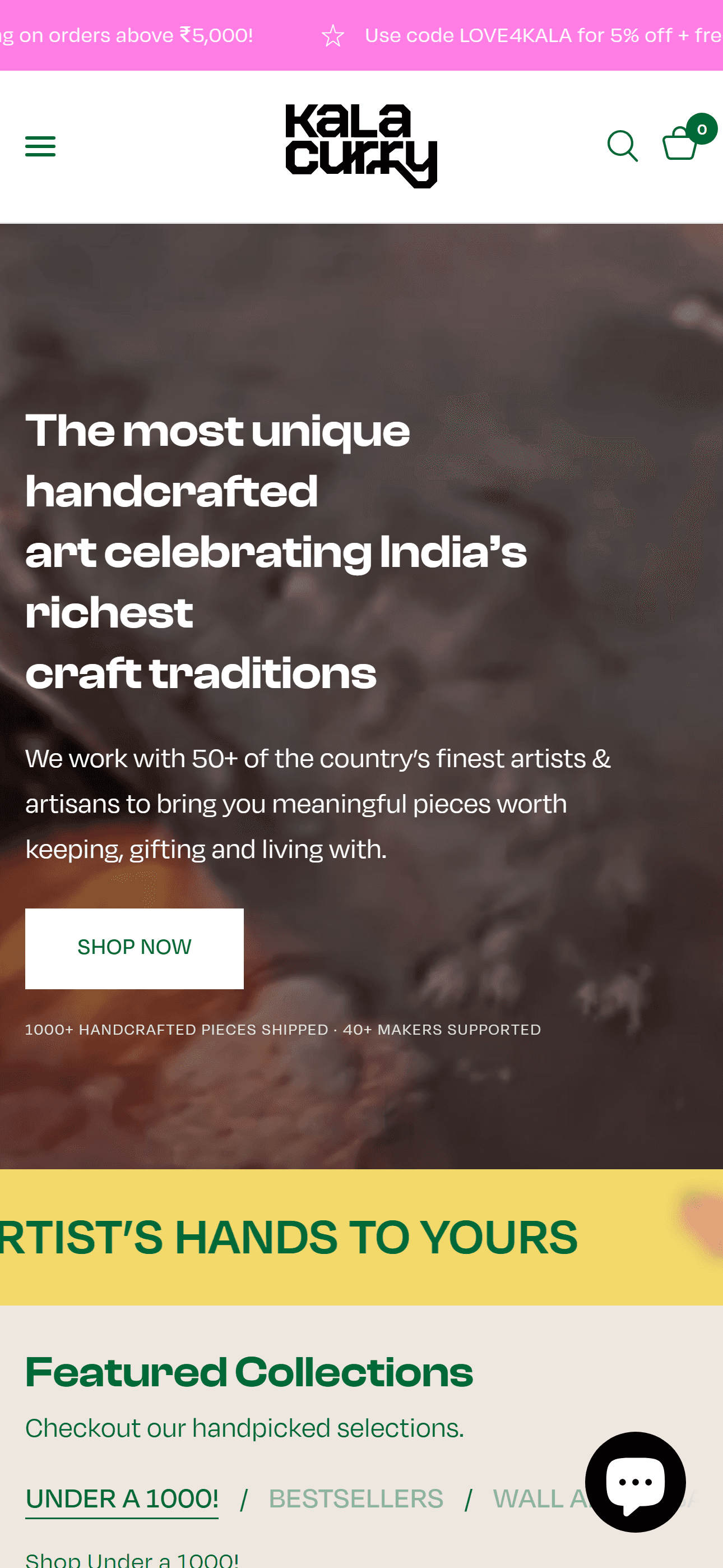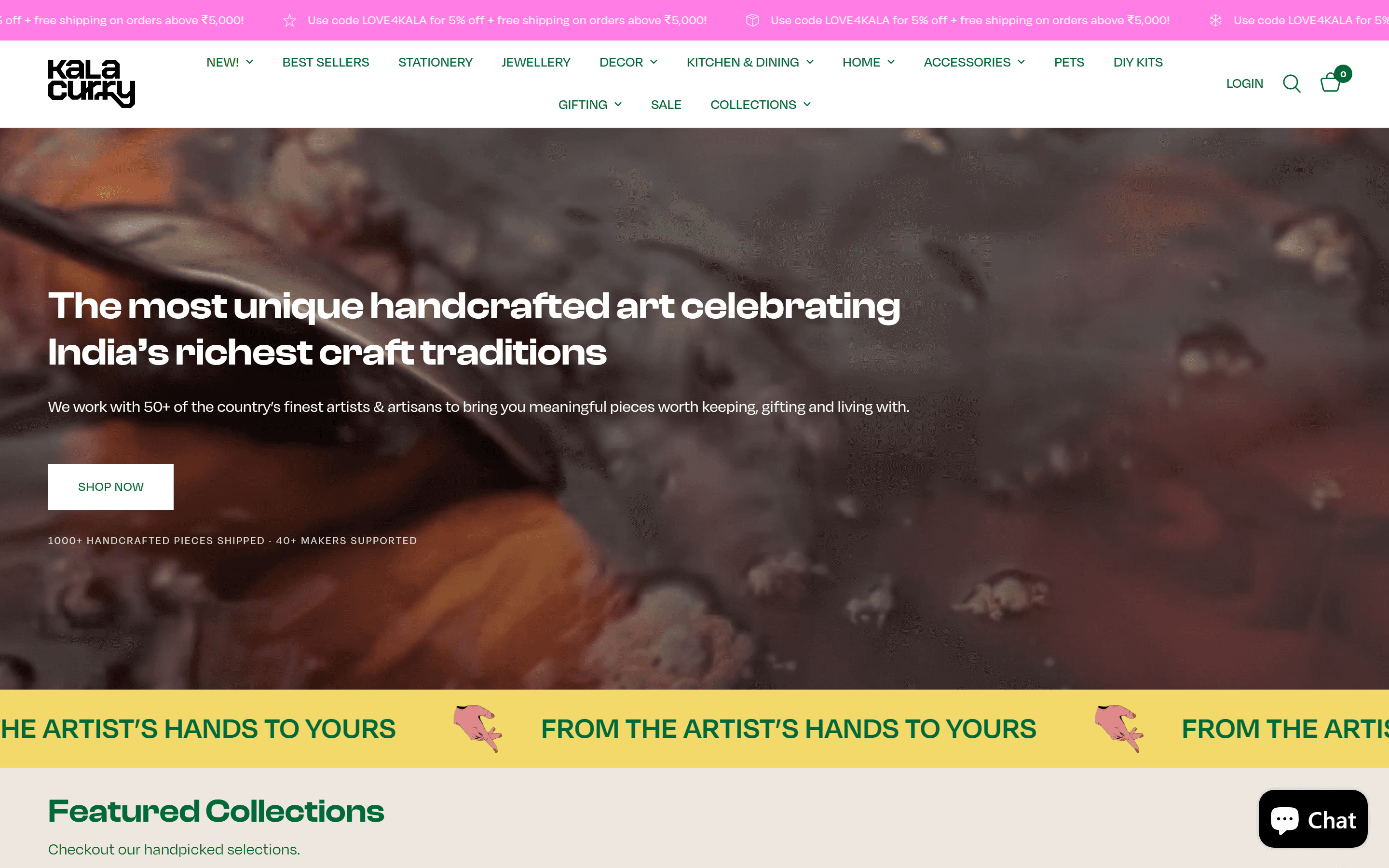 Kala Curry. 800+ products, 56 artisans, 55 collections. A marketplace where the maker is never anonymous.