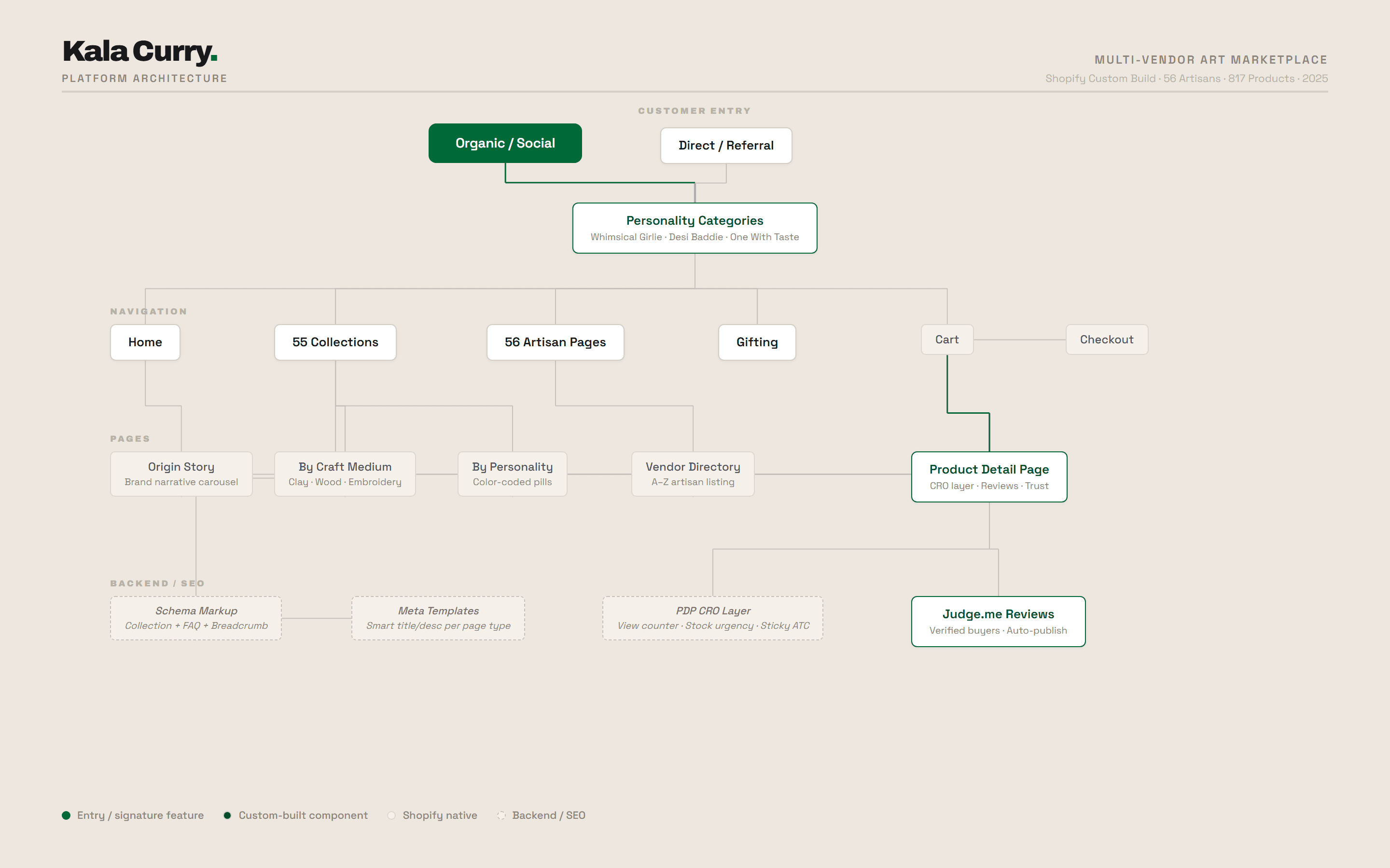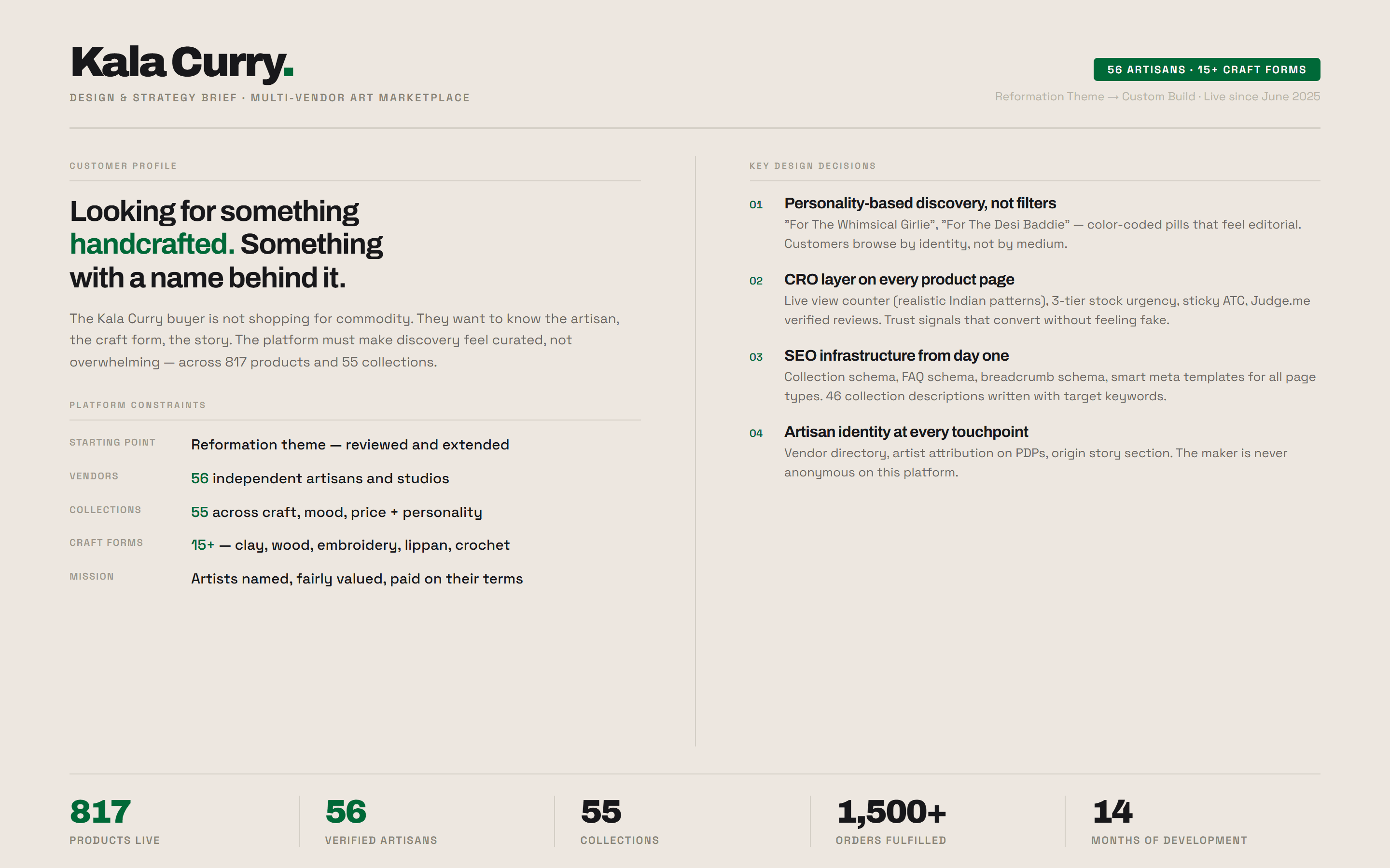 The design brief captures the platform constraints before any code was written. 56 independent artisans and studios. 55 collections across craft, mood, price, and personality. 15+ craft forms from clay to lippan art. The mission: artists named, fairly valued, paid on their own terms. Four decisions shaped everything that followed. Personality-based discovery over traditional filters. A CRO layer on every product page. SEO infrastructure from day one. Artisan identity at every touchpoint. 817 products live. 1,500+ orders fulfilled. 14 months of continuous development.