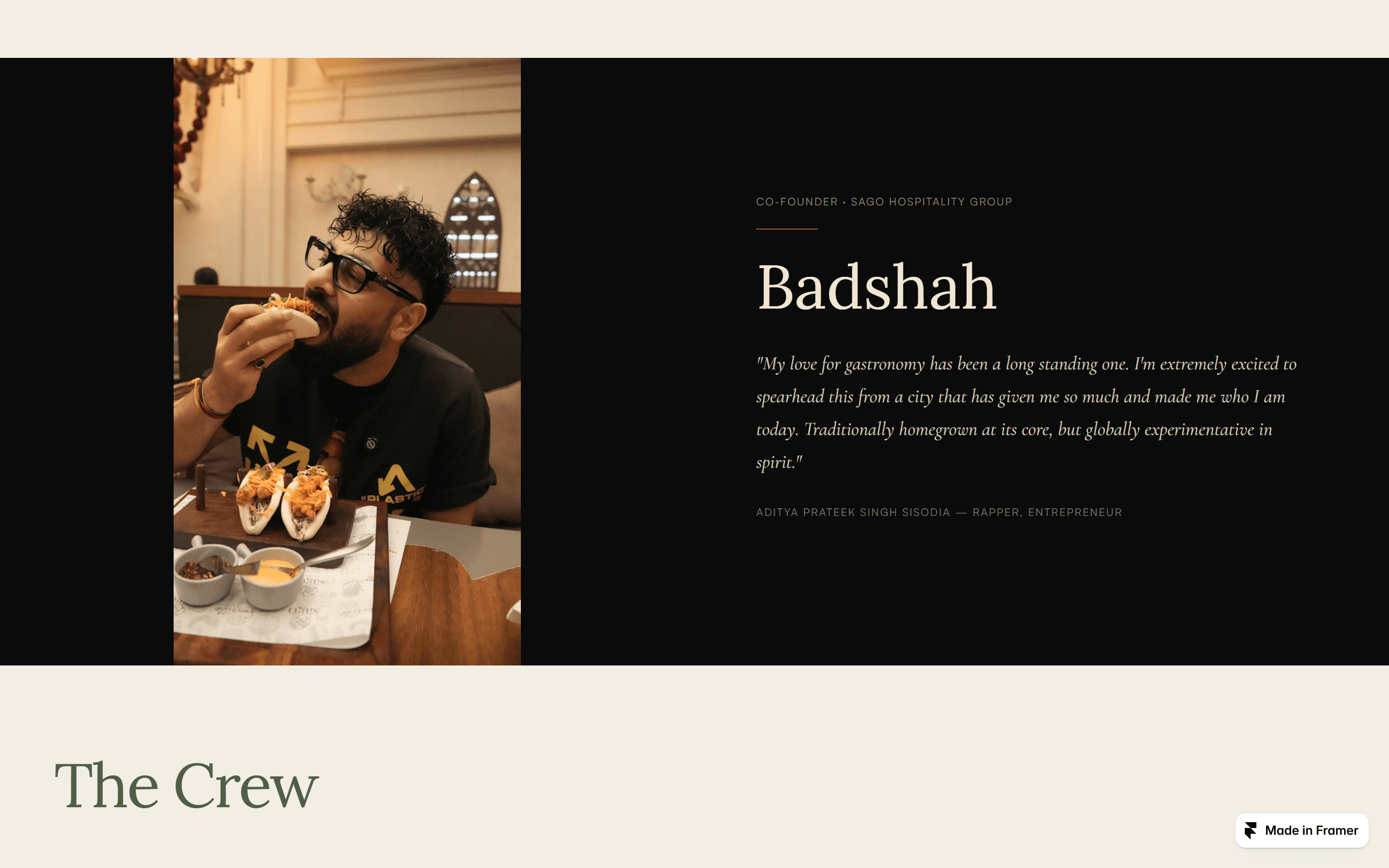 Badshah is not mentioned in a footer credit or a backed-by strip. On the Sago page, mid-scroll, there is a full-width section: dark background in rgb(10, 11, 10), portrait on the left, quote in Cormorant Garamond italic on the right. The attribution reads "ADITYA PRATEEK SINGH SISODIA — RAPPER, ENTREPRENEUR," and above the name: CO-FOUNDER • SAGO HOSPITALITY GROUP. The quote is from his launch statement: "Traditionally homegrown at its core, but globally experimentative in spirit." It is the brand brief for both venues in one sentence.