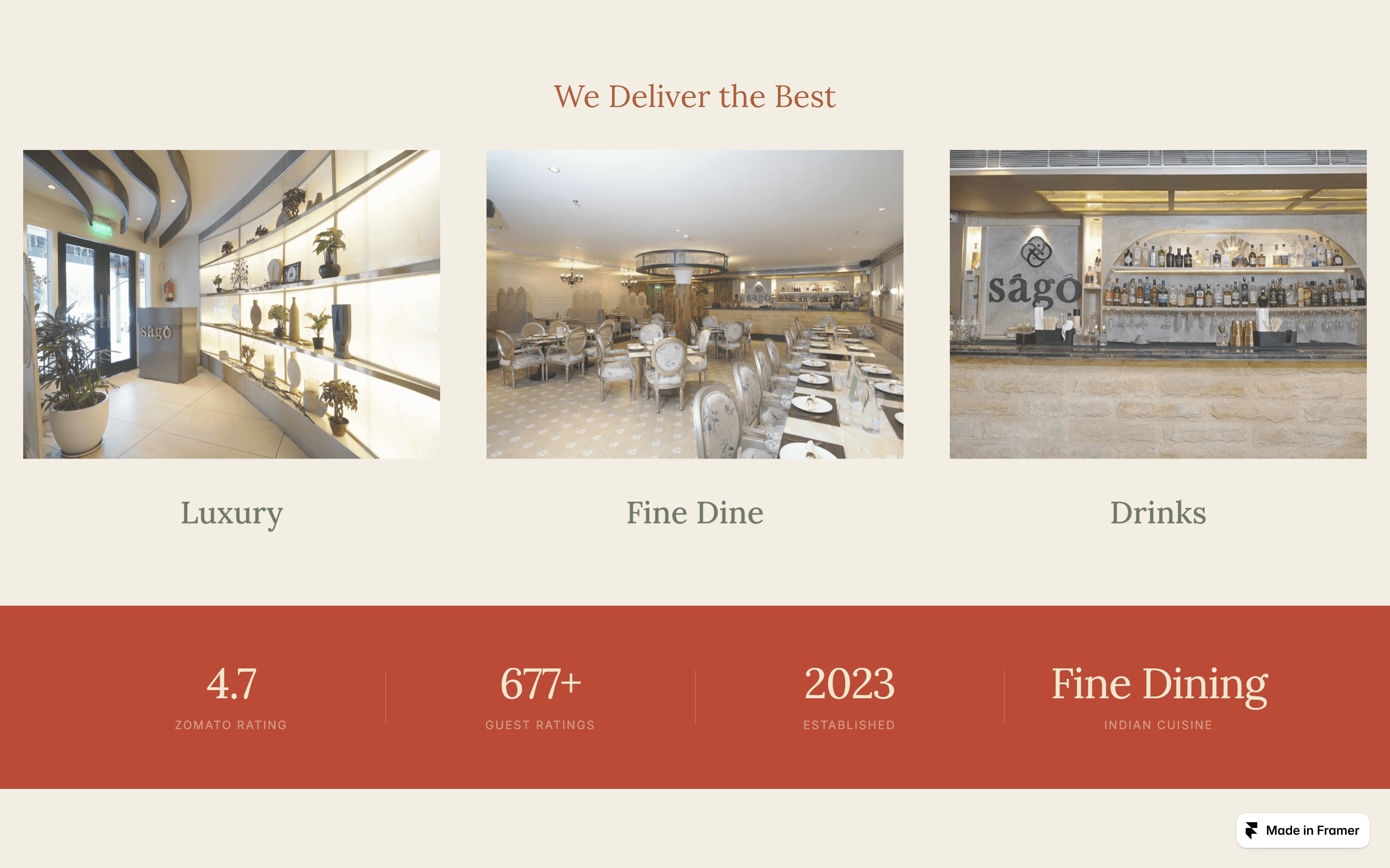Below the Sago hero, three venue photographs labeled Luxury, Fine Dine, Drinks span the full width. Below them: the stats strip in cream on terracotta, 4.7 Zomato rating, 677 guest ratings, 2023 as the year established, Indian Cuisine as the category. No superlatives. The numbers next to the photographs are the argument.
