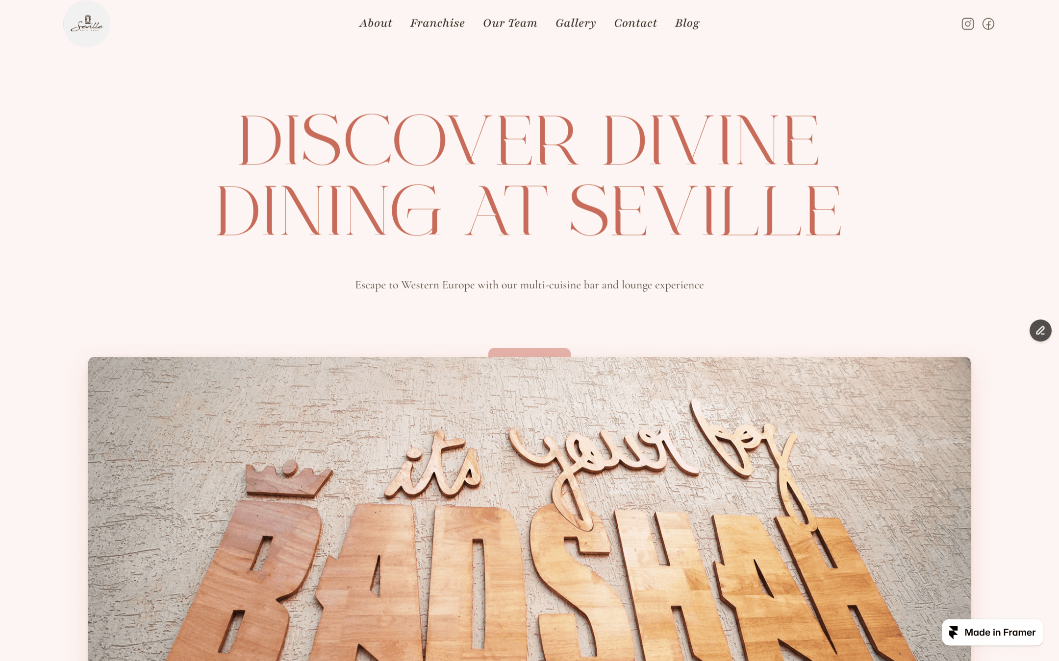 Seville's background is rgb(253, 245, 243), a light blush. Mocktaile Typeface headings read in terracotta. The hero image is a photograph of the venue's 3D wooden lettering installation: "its your boy BADSHAH," a piece of decor that is also a declaration. The about section describes the kitchen and the bar before the gallery does: the Mediterranean spread on the floor above, cocktails served until 3AM on weekends, a room designed for people who are not in a hurry. The stats strip uses dark Cormorant Garamond numbers against the blush, a different treatment than Sago's cream-on-terracotta.