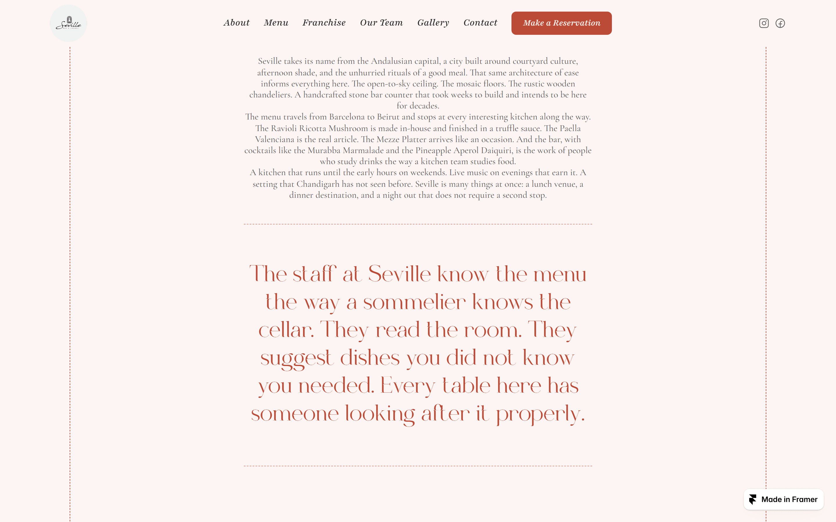 Seville's about section opens: Seville takes its name from the Andalusian capital, a city built around courtyard culture, afternoon shade, and the unhurried rituals of a good meal. That same architecture of ease informs everything here. The open-to-sky ceiling. The mosaic floors. The rustic wooden chandeliers. Below it, a pull quote in Forum italic: The staff at Seville know the menu the way a sommelier knows the cellar. The copy sets the room before the photographs arrive. By the time the gallery loads, the visitor already knows what kind of place this is.