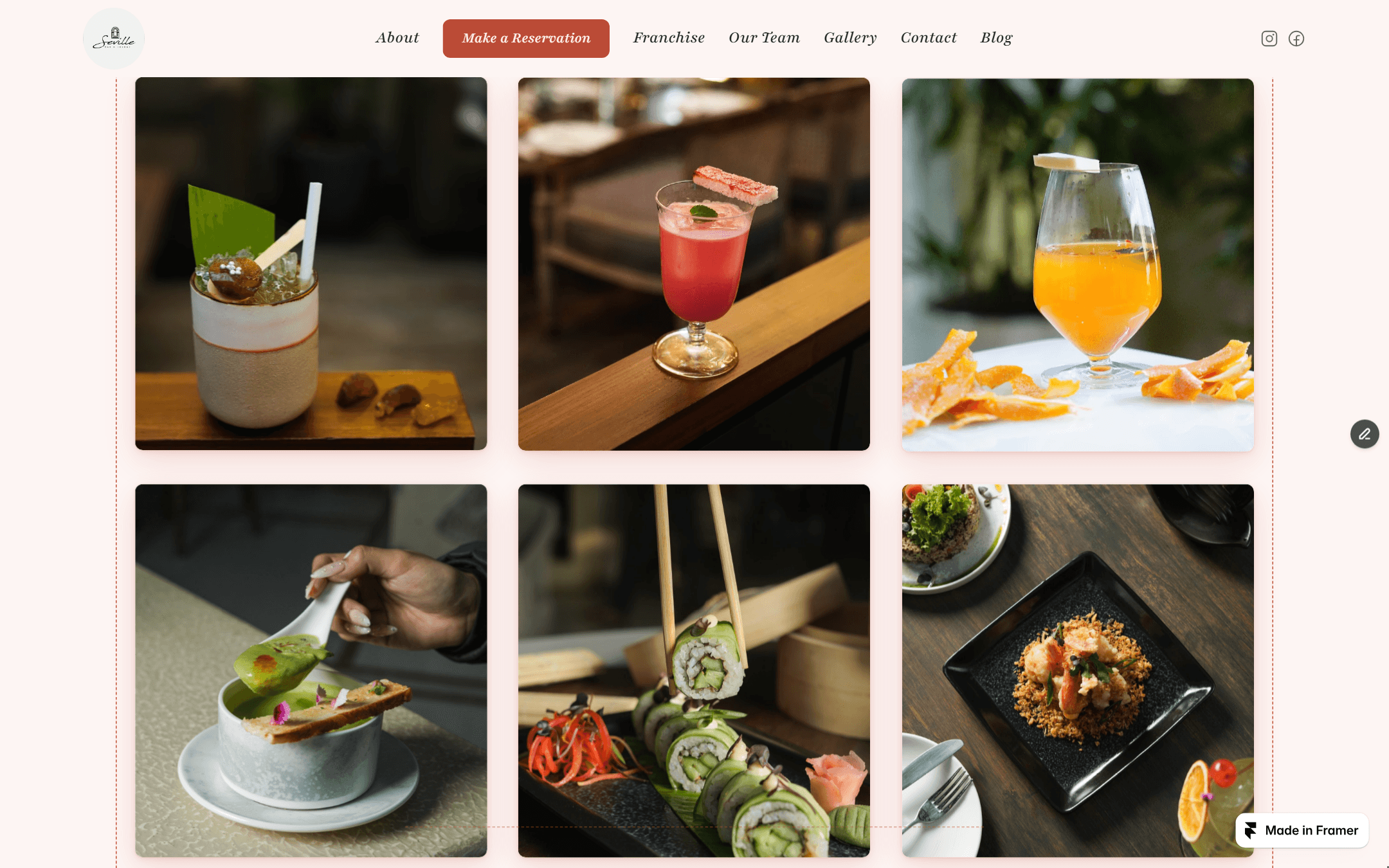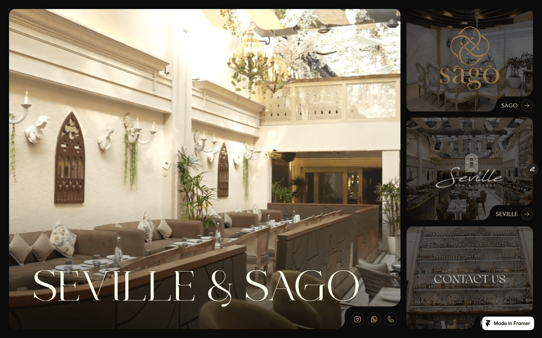 Seville's gallery runs six photographs in a two-row grid: cocktails with elaborate garnishes, sushi rolls, plated Mediterranean mains. The photography is commissioned, not stock. @seville.chd has around 15,000 Instagram followers compared to @sago.chd's 3,200. Seville is the social anchor of the two venues. The gallery on the website reads like the feed: color, plating, light.